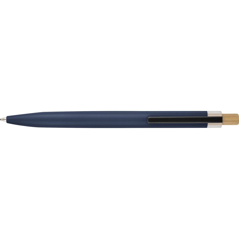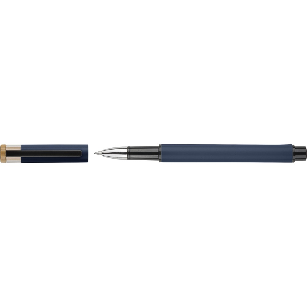 Újrahasznosított alumíniumból készült, lakkozott tollszett golyóstollal és rollerball tollal. A golyóstoll bambusz nyomógombbal, rPET díszítéssel és fém klippel rendelkezik, míg a rollerball toll bambusz/rPET kupakdíszítéssel és hozzá illeszkedő klippel. A tolltesten gravírozott recycled (újrahasznosított) alapanyagra utaló logó található mindkét toll esetében. A golyóstoll kb. 700 méter, a roller toll kb. 500 méter íráskapacitású, mindkettő kék színű tollbetéttel. Színes, újrahasznosított kartonból készült ajándékdobozba csomagolva.
