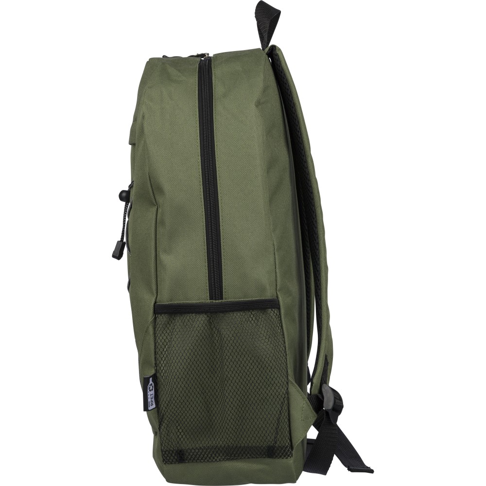 RPET poliészter 600D anyagból készült hátizsák húzózsinóros záródással és nagy cipzáras fő rekesszel. Hálós oldalzsebekkel, rugalmas elülső pántokkal, dekorációhoz kialakított kis elülső cipzáras zsebbel és állítható vállpántokkal rendelkezik. A terméken rPET alapanyagra utaló címke található.