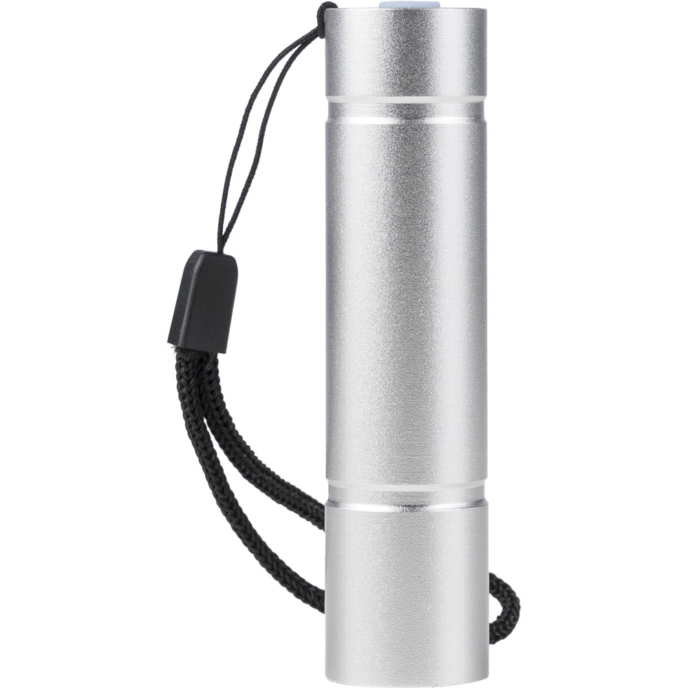 Újrahasznosított alumíniumból készült COB zseblámpa (80-100 lumen) 3 világítási móddal, nyomógombbal, csuklópánttal és gravírozott recycled (újrahasznosított) alapanyagra utaló logóval. USB-C-n keresztül újratölthető (300 mAh), a csomag része egy 30 cm-es kábel. Illusztrációval ellátott barna dobozba csomagolva.