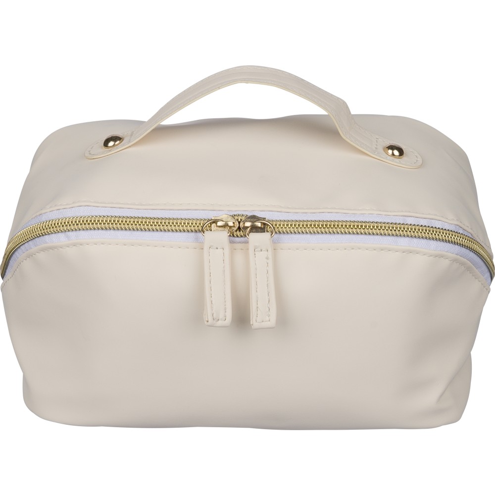 Újrahasznosított PU anyagból készült neszesszer középen elhelyezett cipzárral a széles nyithatóság érdekében. Rövid fogantyúval, tágas belső térrel és négy rekesszel, beleértve egy belső cipzáras zsebet. 210D újrahasznosított béléssel készült, belsejében egy újrahasznosított alapanyagra utaló címkével.