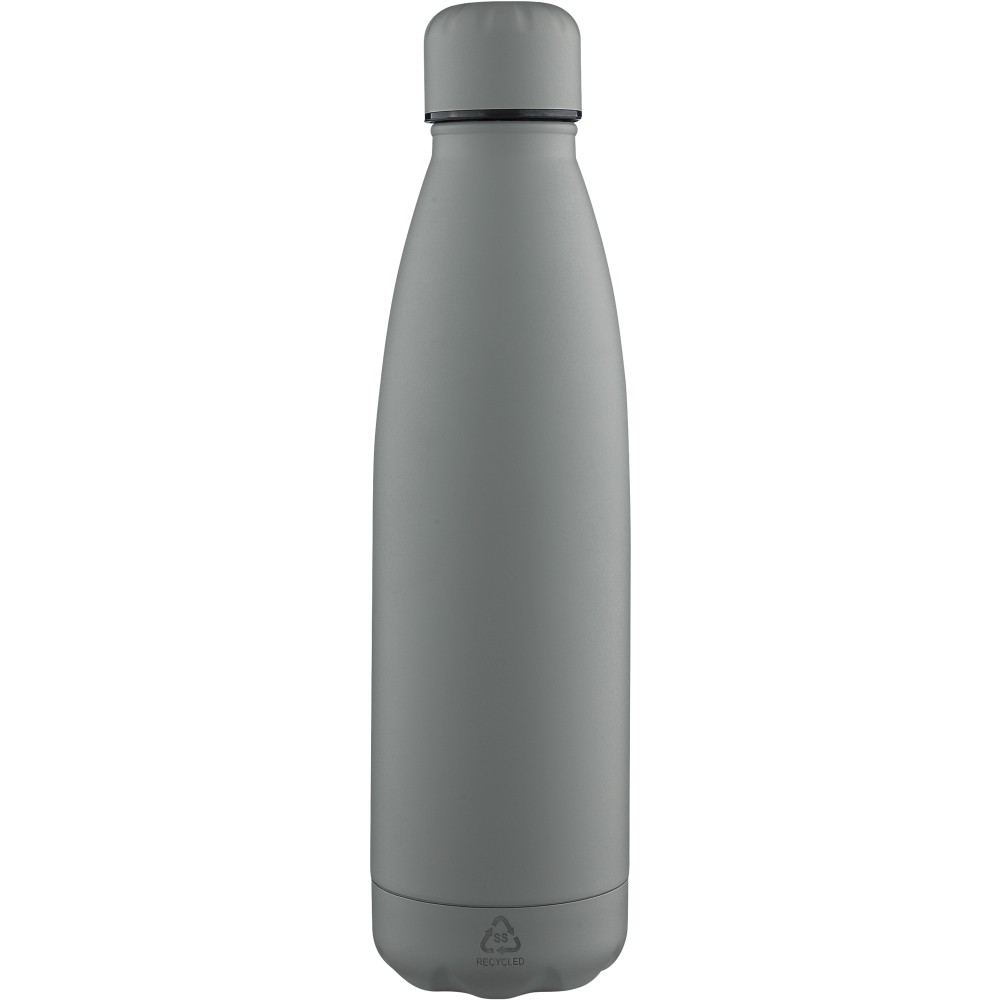 Újrahasznosított rozsdamentes acél ivópalack 500 ml-es űrtartalommal. Duplafalú szigetelés, amely akár 12 órán át melegen vagy hidegen tartja az italokat. A 304-es rozsdamentes acél belső kiváló tartósságot, rozsdaállóságot és biztonságos élelmiszer-érintkezést garantál. Selymes matt színű felülettel. A csavaros fedél és az aljzat színben egyezik a tiszta, egységes megjelenés érdekében. A palack elülső részén gravírozott újrahasznosított logó található. Egyenként, barna kartondobozba csomagolva.
