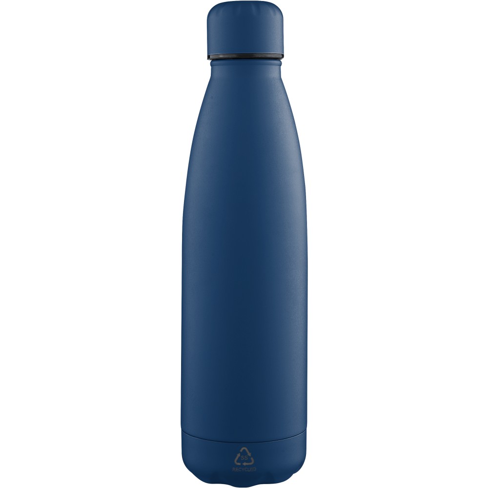 Újrahasznosított rozsdamentes acél ivópalack 500 ml-es űrtartalommal. Duplafalú szigetelés, amely akár 12 órán át melegen vagy hidegen tartja az italokat. A 304-es rozsdamentes acél belső kiváló tartósságot, rozsdaállóságot és biztonságos élelmiszer-érintkezést garantál. Selymes matt színű felülettel. A csavaros fedél és az aljzat színben egyezik a tiszta, egységes megjelenés érdekében. A palack elülső részén gravírozott újrahasznosított logó található. Egyenként, barna kartondobozba csomagolva.
