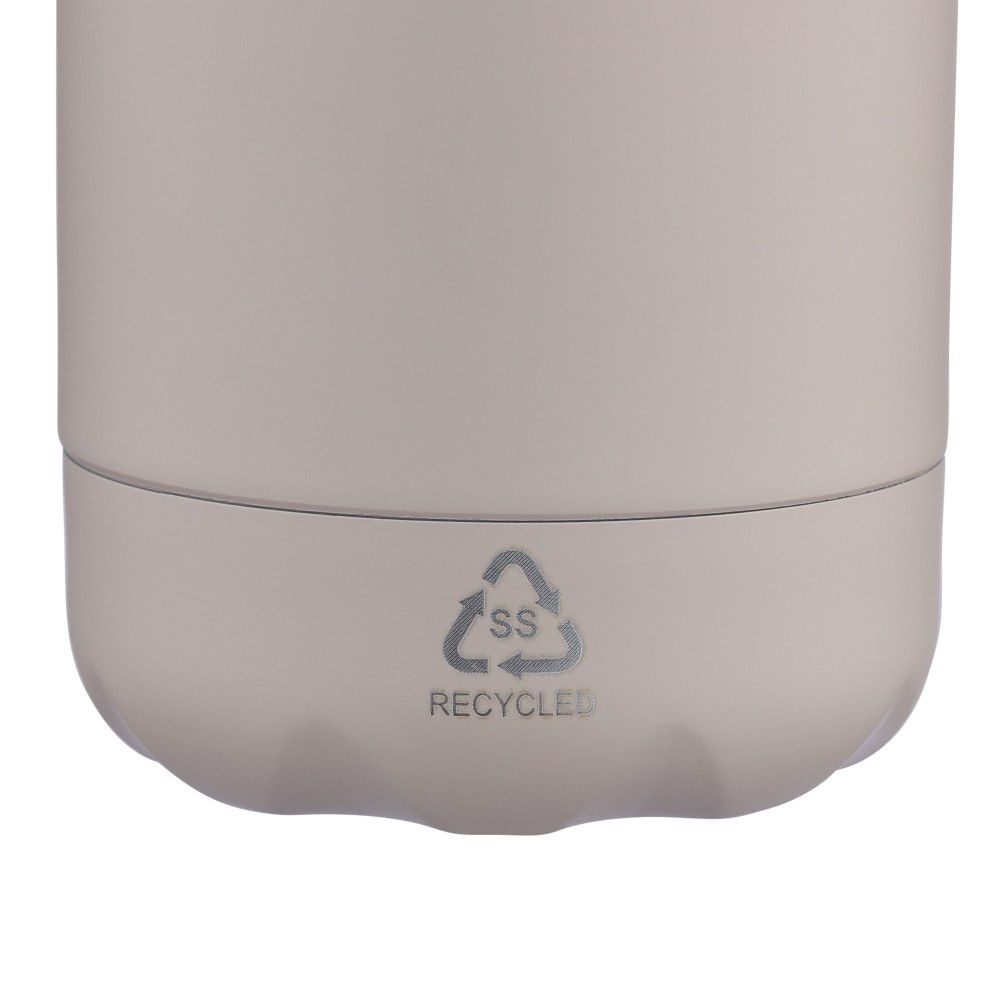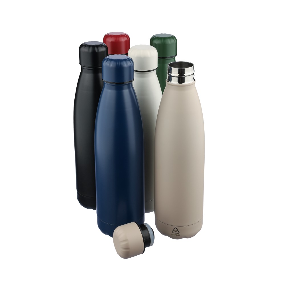 Újrahasznosított rozsdamentes acél ivópalack 500 ml-es űrtartalommal. Duplafalú szigetelés, amely akár 12 órán át melegen vagy hidegen tartja az italokat. A 304-es rozsdamentes acél belső kiváló tartósságot, rozsdaállóságot és biztonságos élelmiszer-érintkezést garantál. Selymes matt színű felülettel. A csavaros fedél és az aljzat színben egyezik a tiszta, egységes megjelenés érdekében. A palack elülső részén gravírozott újrahasznosított logó található. Egyenként, barna kartondobozba csomagolva.