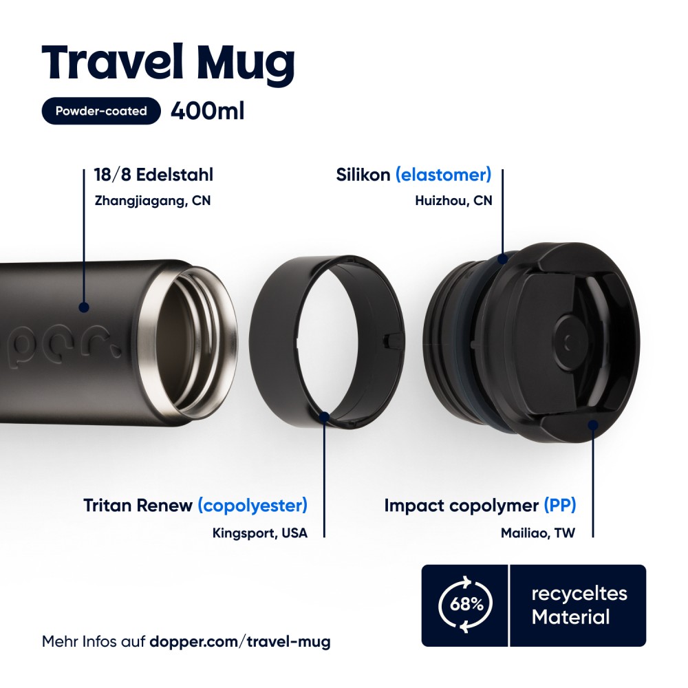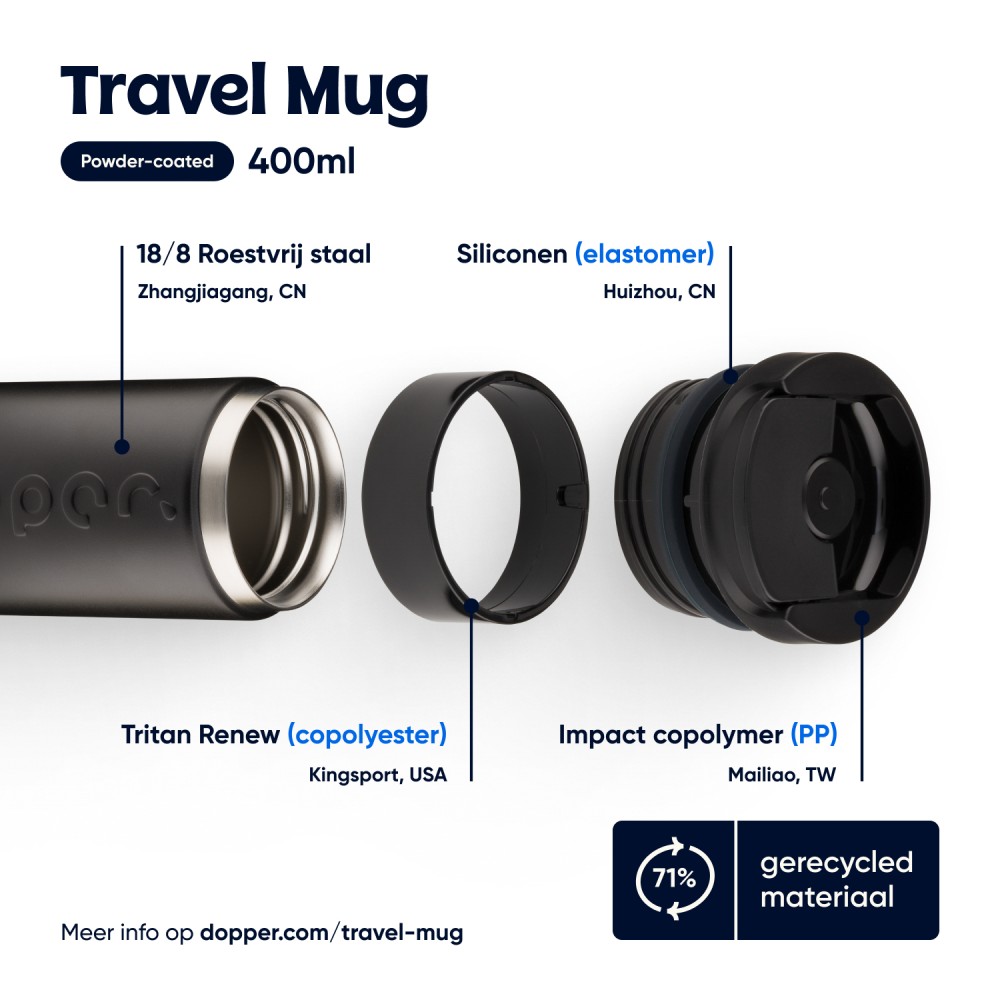 Legyen szó reggeli kávéról, napközbeni hidratálásról vagy egy esti szénsavas italról, ezt a Dopper Travel Mug-ot úgy tervezték, hogy mindenre alkalmas legyen. A meleg italokat akár 6 órán át melegen, a hideg italokat pedig 20 órán át hűvösen tartja. Duplafalú, 90%-ban újrahasznosított rozsdamentes acél testtel és tartós bevonattal készült. A könnyen nyitható, lepattintható kupak egyszerűvé és kényelmessé teszi a használatot útközben is. Mosogatógépben (emblémázás nélkül) 65 °C-ig tisztítható. Kérjük, vegye figyelembe, hogy kávé vagy tea használata esetén elszíneződés vagy szagmaradvány előfordulhat. Forró italok fogyasztásakor járjon el óvatosan!