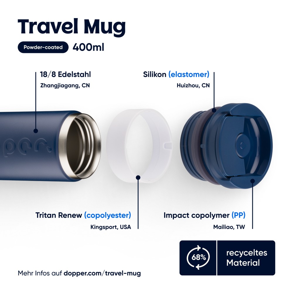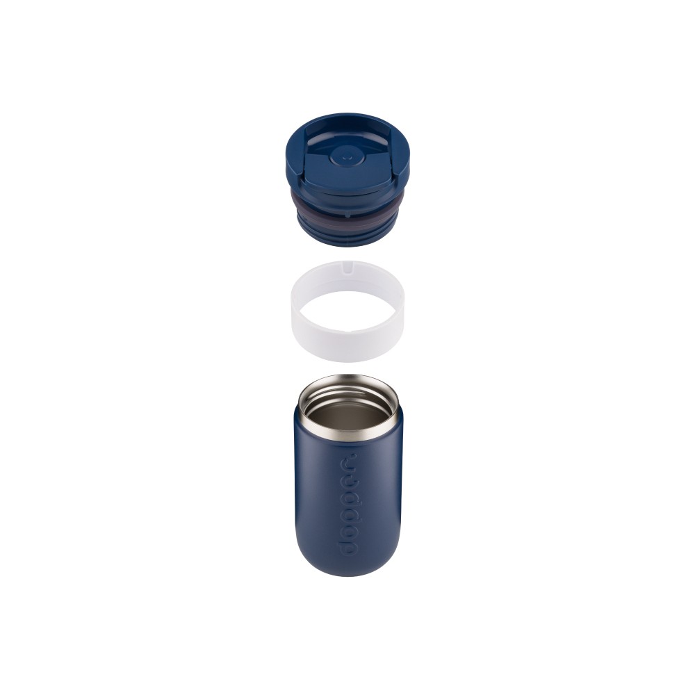 Legyen szó reggeli kávéról, napközbeni hidratálásról vagy egy esti szénsavas italról, ezt a Dopper Travel Mug-ot úgy tervezték, hogy mindenre alkalmas legyen. A meleg italokat akár 6 órán át melegen, a hideg italokat pedig 20 órán át hűvösen tartja. Duplafalú, 90%-ban újrahasznosított rozsdamentes acél testtel és tartós bevonattal készült. A könnyen nyitható, lepattintható kupak egyszerűvé és kényelmessé teszi a használatot útközben is. Mosogatógépben (emblémázás nélkül) 65 °C-ig tisztítható. Kérjük, vegye figyelembe, hogy kávé vagy tea használata esetén elszíneződés vagy szagmaradvány előfordulhat. Forró italok fogyasztásakor járjon el óvatosan!