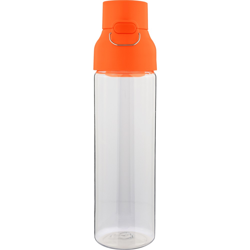 Tritán vizespalack 750 ml-es űrtartalommal, átlátszó palacktesttel és színes kupakkal. Tartós és könnyű anyagokból (PP) készült, amelyek ellenállnak a nedvességnek, a vegyszereknek és a mindennapi igénybevételnek. Mindennapi használatra tervezve; biztonságos nyomógombos zárral és felső hordozófogantyúval rendelkezik. Alkalmas munkához, iskolához vagy szabadtéri tevékenységekhez.